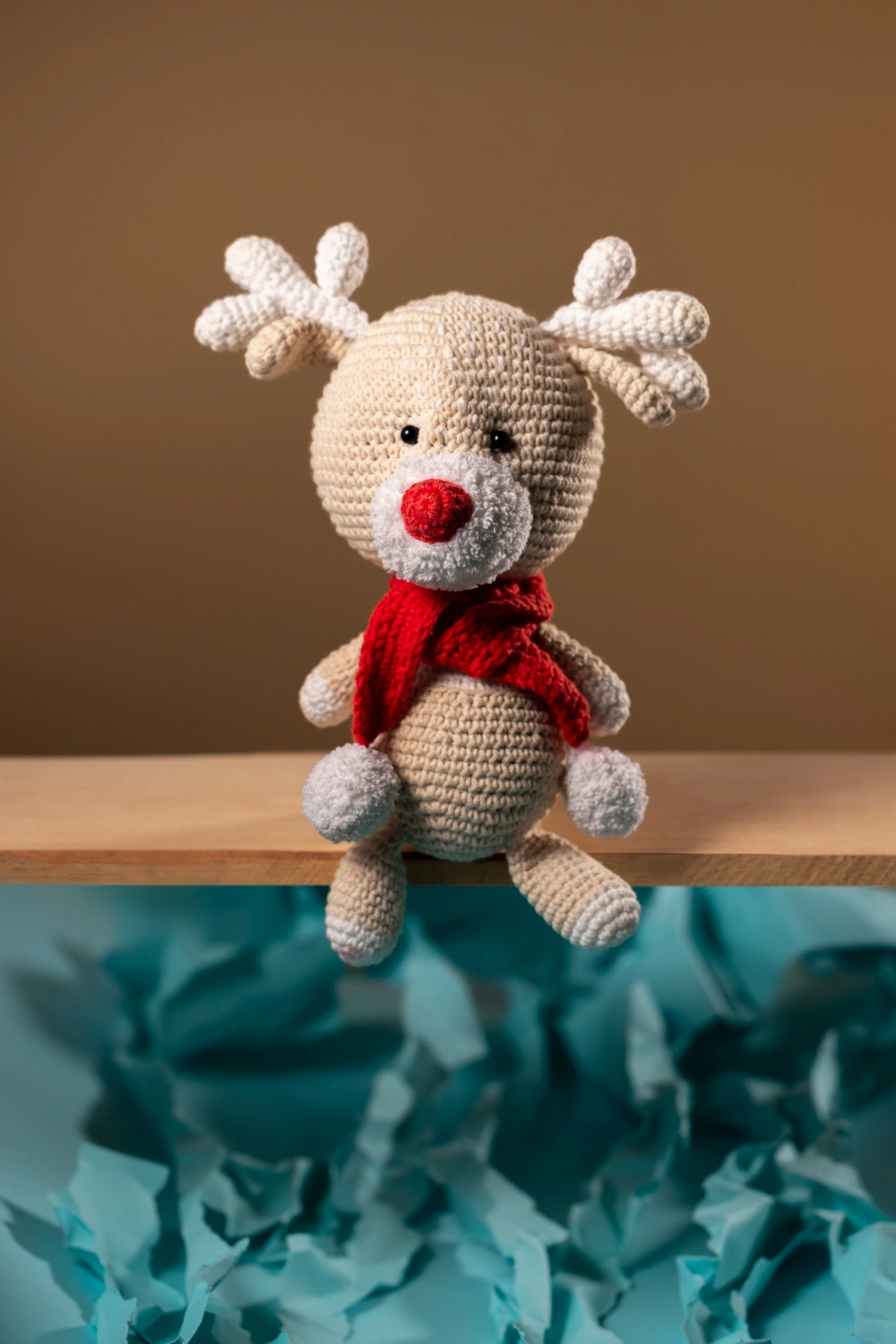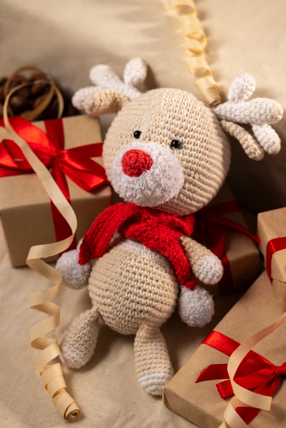 Den här charmiga handvirkade renen är skapad för att sprida värme, trygghet och vintermagi. Med sin mjuka struktur, sin röda nos och den gosiga halsduken i varm julröd ton blir den snabbt en favorit hos både små och stora.